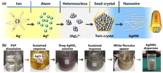 (a) Growth mechanism of AgNWs; (b) The color change of the reaction solution during the growth process.