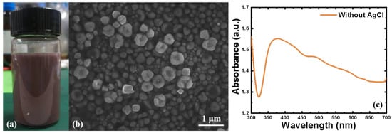 (a) Picture of product solution without adding AgCl; (b) Scanning electron microscopy (SEM) image of the product without adding AgCl; (c) UV–vis absorption spectra of product solution without adding AgCl.
