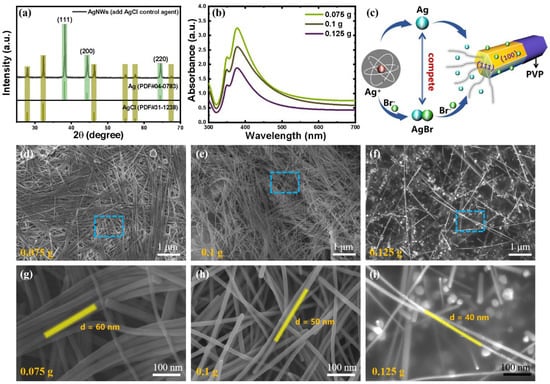 Figure 5d–i are the SEM images of AgNWs prepared by adding different amounts of KBr in the reaction solution. The AgNWs show a trend of thinning with the increase in the amount of KBr added, its diameter has dropped from an average of 60 nm to an average of 40 nm. In addition, a small amount of silver nanoparticles were produced when 0.125 g of KBr was added. Figure 5b shows the UV–vis absorption spectra of products with different amounts of KBr. The amount of KBr added is 0.075 g, 0.1 g, and 0.125 g, respectively. The absorption peaks appear at 350 nm and 380 nm, which are characteristic absorption peaks of AgNWs. The half-peak width of the absorption peak decreased with the increase in the amount of KBr, indicating that the diameter of the AgNWs became thinner. Figure 5c shows the mechanism of Br− in the preparation of AgNWs. The effect of Br− on the morphology of AgNWs is mainly due to the fact that it can react with Ag+ to form AgBr. AgBr is a solid and difficult to dissolve, so the Ag+ content in the reaction solution is reduced to a certain extent. The reduction rate of silver atoms in the reaction system is reduced, the nucleation rate is increased, and the growth of crystal seeds along the (111) plane is accelerated under the action of the coating agent PVP [31]. On the other hand, Br− adsorbs the surface of the AgNWs, thus reducing the deposition of silver particles on the AgNWs and making them thinner.