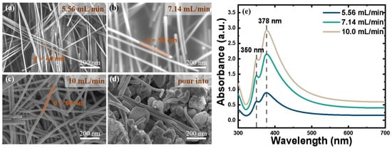 The concentration of Ag+ in the reaction solution of preparing AgNWs by polyol is an important factor in determining the morphology of AgNWs. AgNO3 is a silver source that provides Ag+ to the reaction solution, so the dropping speed of the AgNO3 solution affects the concentration of Ag+ in the reaction solution. Figure 7a–d are the SEM images of AgNWs when the dropping accelerations of AgNO3 solution are 5.56 mL/min, 7.14 mL/min, 10 mL/min, and poured directly, respectively. The diameter of AgNWs gradually increases with the increase in the AgNO3 solution drop acceleration (the diameters are about 40 nm, 50 nm, and 60 nm, respectively). When the AgNO3 solution is poured directly, only a small amount of silver nanowires are produced (Figure 7d). Figure 7e shows the UV–vis absorption spectra of the products at different dropping accelerations of the AgNO3 solution. All products have absorption peaks at 350 nm and 378 nm, which are caused by the plasma resonance of AgNWs. The half-peak width of the absorption peak widened with the increase in the concentration of AgNO3 solution, which was caused by the increase in the diameter of the AgNWs. It shows that the diameter of silver nanowires increases with the increase in the AgNO3 solution drop acceleration.