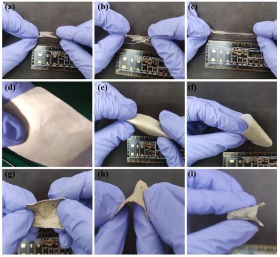 The flexibility and excellent mechanical properties of the base material play a key role in the stability of the flexible stretchable electrode. Therefore, we choose PDMS, paper, and nonwoven fabric as the flexible stretchable electrode substrates. Figure 8a–c shows that PDMS has excellent flexibility and extensibility, which can be stretched to 300% of the original length. When the PDMS-based flexible stretchable electrode was stretched, it was found that the conductive functional layer composed of silver nanowires would peel off from the PDMS substrate. Therefore, the surface adhesion of the PDMS substrate is not good enough. Figure 8d–f shows the pictures of the paper-based flexible stretchable electrode under different deformation. The electrode can achieve 90° and nearly 360° bending deformation. Figure 8g–i shows the physical image of a nonwoven flexible stretchable electrode. The nonwoven surface still retains its original softness and lightness after depositing AgNWs. Moreover, the AgNWs are firmly attached to the nonwoven fabric surface. Under repeated bending, the functional layer formed by the conductive material of the AgNWs does not break and peel off the substrate.