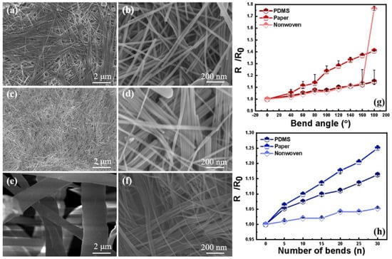 Figure 9a,b shows that the AgNWs are evenly distributed on the PDMS-based surface. The substrate surface is not exposed and is completely covered by dense AgNWs. In general, the more evenly distributed and densely covered the AgNWs on the substrate surface, the better the conductivity of the conductive film. This is mainly due to the AgNWs being covered and deposited on the surface of the substrate to form a conductive path, making the initially insulated substrate conductive. Figure 9c,d shows that the AgNWs are interlaced on the paper surface, forming a uniform and dense AgNWs coating. It indicates that the AgNWs have good deposition on the paper-based. Due to the hydrophilicity and capillarity of the paper-based, the liquid of the AgNWs dispersion is rapidly absorbed, and the AgNWs are quickly deposited on its surface and attached. It avoids the uneven distribution of the conductive layer of AgNWs due to the accumulation or dissociation of silver nanowires when flowing with liquid. The internal 3D porous structure of the paper-based also increases the deposition rate of AgNWs dispersion, further enhancing the flatness of the AgNWs layer. Different from PDMS and paper base, it can be seen that the nonwoven fabric is composed of fibers with the naked eye. Therefore, we observed the SEM images of the nonwoven fabric not impregnated with AgNWs. Figure 9e shows that nonwoven fabric is interwoven by multiple fibers. Figure 9f shows that the AgNWs with uniform diameter form a dense conductive layer on the surface of the nonwoven fabric. The AgNWs only deposit on the nonwoven fabric surface to form a functional layer, instead of penetrating the interior and wrapping the interior fibers. Polypropylene, the raw material of the nonwoven fabric, is nonpolar in structure and has almost no hydrophilic group, so nonwoven fabric does not absorb water or even directly repel water. The AgNWs on the surface of the nonwoven fabric cannot penetrate the internal structure of the nonwoven fabric with the liquid.