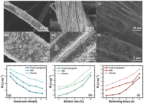 SEM images of conductive fabrics prepared based on the impregnation process: (a,b) Porous fabric; (c,d) Coarse jacquard fabric; (e,f) Rib fabric; (g) Plot of square resistance of conductive fabric with immersion time; (h) Plot of square resistance of conductive fabric with the stretch rate; (i) Plot of square resistance of conductive fabric with stretching times.