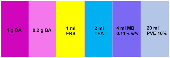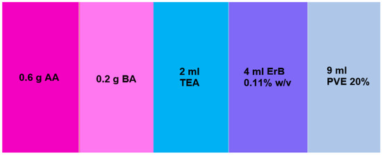 AA-based photopolymers have been under development and optimisation for many years [13,14,15] and have found many different optical applications [16,17,18]. A typical chemical composition of an AA-based photopolymer sensitive to green light is the following (Figure 1): 0.6 g monomer (AA), 2 mL TEA, 0.2 g cross-linking monomer N,N′-methylenebisacrylamide (BA), 4 mL erythrosin B (EB) dye (0.11% wt. water stock solution), and 9 mL stock solution of PVA in water (20% wt.) [19].