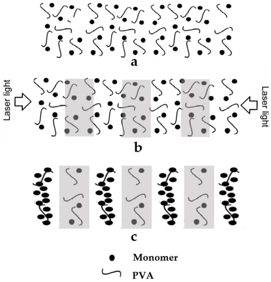 Schematic of the photopolymerisation process in a photopolymer layer during hologram recording: (a) photopolymer layer before exposure to laser light; (b) exposure to light; (c) photopolymer layer after light exposure.
