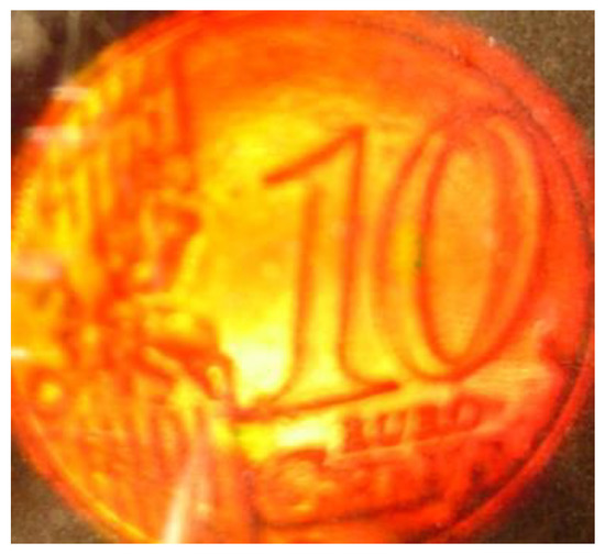 Figure 3 shows a photograph of a reflection hologram of a 10-cent coin, recorded in the DA-based photopolymer layer, whose chemical composition is presented in Figure 4.