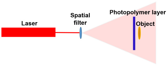 Figure 2 presents a schematic of the photopolymerisation process in the photopolymer layer during hologram recording. A diffraction grating is recorded (Figure 2c) when the photopolymer layer is illuminated by two beams of laser light (Figure 2b).