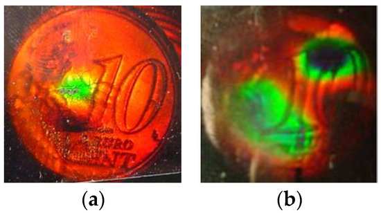Finally, the review describes an optimised DA-based photopolymer composition, which shows a remarkable improvement in holographic recording abilities in comparison to other recently developed, water-soluble, “green” photopolymer materials [19,20,21,22,23]. This material’s self-processing nature and low cost of production mean it is an excellent candidate for different industrial holographic applications. In addition, the DA-based holographic material is capable of recording reflection gratings with a high diffraction efficiency of 50%, the highest reported value for the diffraction efficiency of reflection holograms. Another attractive property of this new material is its high sensitivity to pressure, which can be controlled by changing its composition. Thus, the development of pressure sensors with different specifications is possible. Pressure-sensitive photopolymers open the possibilities for the production of new types of colour holograms.