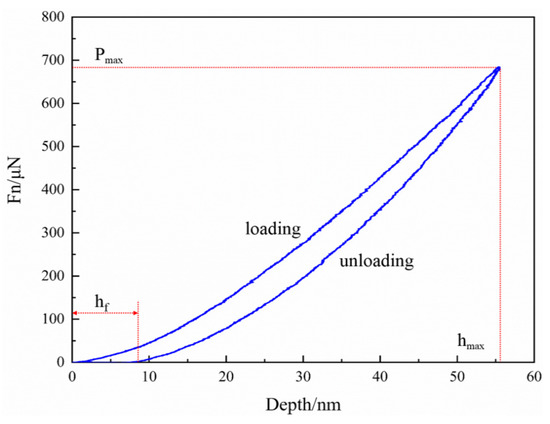 Figure 3 shows the loading-unloading curve of h-BN coatings. The hf and hmax are the residual indentation depth and the maximum indentation depth, respectively. The Pmax is the peak load at hmax. The results show that the hardness of the coatings is 3.42 GPa, the elastic modulus is 46.29 GPa, and the H/E value of the coating is 0.074. It is found that the maximum displacement of h-BN coatings is 55.5 nm and hf is 8nm, and the elastic recovery rate is 85.6%. It is well known that the large recoverable strain is important for improving the tribological properties of the friction system apart from high H/E value because large recoverable strain is restored at initial state.