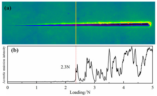 Detailed analysis of h-BN coatings. (a) microscopic record, (b) the acoustic emission record showing the critical load of the coatings first penetration.
