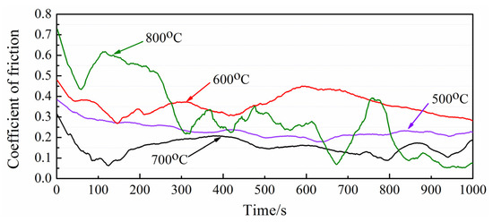 Figure 5 shows the CoF curves of h-BN coatings in the atmospheric environment from 500 to 800 °C. The tendency of the CoF curve is different in each CoF curve among all the temperatures according to Figure 5. Figure 6 shows the details of the CoF curves of h-BN coatings in the atmospheric environment from 500 to 800 °C. It shows that h-BN coatings are beneficial to improve high temperature antifriction behaviors of steel. The tendency of the CoF curve is slightly different although all initial CoFs are the maximum value in each CoF curve among all the temperatures. At 500 °C, CoF decreased first and then increased slightly with the increase in sliding time. The initial CoF was 0.39 at 500 °C, and then decreased gradually, and the average CoF was around 0.13 at the steady stage. At 600 °C, the initial CoF was around 0.48, and then decreased to a low value; however, this CoF value at the same time was little higher than that at 500 °C. At about 150 s, CoF reached around 0.45 at 610 s, and finally decreased around 0.05, as shown in Figure 6b. At 700 °C, CoF decreased from 0.3 to 0.05 for the period of 140 s, and then fluctuated with the sliding time, average CoF was about 0.07. At 800 °C, CoFwas as high as 0.72 in the initial stage, and then decreased and increased alternately fluctuations, and CoF reached to the minim value of 0.017 around 1800 s, and then CoF increased again with the increase in the remaining sliding time.