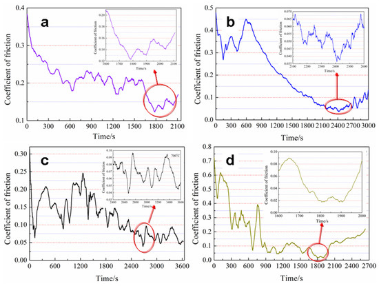 CoF of BN coatings under different temperatures in details: (a) 500 °C, (b) 600 °C, (c) 700 °C and (d) 800 °C.