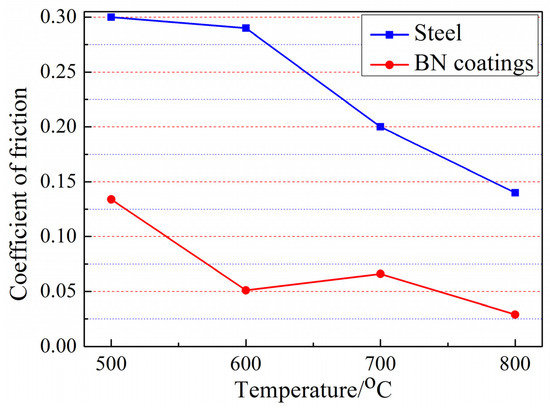 Hexagonal boron nitride (h-BN) exhibits a good combination of the properties of high chemical stability, high mechanical strength, high thermal conductivity and low density of surface dangling bonds. The h-BN has a lamellar crystal structure and is served as solid lubricant with low coefficient of friction (CoF), even superlubricity [16,17,18,19,20,21]. The h-BN as solid lubricant is used in two ways. One is that h-BN powders are used as solid lubricants in the metal or ceramic matrix materials. Chen et al. studied the friction behaviors of the SiC/h-BN composites with different volume fractions of h-BN from room temperature to 900 °C [22]. The ZrO2/h-BN/SiC composite exhibits good lubricating behaviors, as low as below 0.3 of CoF above 800 °C [23]. CoF and wear rate of Ag/h-BN-containing Ni-based composites were found to decrease with the increasing temperature from room temperature to 600 °C [24]. TiB2 and TiN playing a role in the wear-resistance were synthesized in situ in the Ni60/h-BN coatings on Ti-6Al-4V alloys during high power laser irradiation, and the metal oxides (TiO2, Al2O3, NiO and Fe2O3) were synthesized in situ during high temperature sliding, exhibiting good anti-friction behavior at 600 °C [25]. The h-BN powders were used to the sliding interface of Si3N4 against die steel H13 at 800 °C. The anti-wear behaviors of h-BN lubricating film are featured to the gradual undermining and complete damage [26]. Moreover, h-BN has been found to perform worse than graphite in terms of friction and material transfer in high temperature aluminum forming [27]. The other way is that h-BN is used as solid lubricant coating with good tribological properties for the sliding components made of the substrate steels at high temperature [28,29]. The h-BN coating prepared from a polyborazylene (PBN) polymeric precursor was deposited on titanium-based substrates and annealed via infra-red irradiation in a rapid thermal annealing (RTA) furnace. CoF was reduced from 0.72 for the Ti/stainless tribosystem to 0.35 for the Ti/h-BN/stainless tribosystem at 360 °C [19]. The tribological characteristics of single-layer h-BN were investigated to elucidate the feasibility as a protective coating layer and solid lubricant for micro- and nano-devices. The results indicate that the friction of h-BN before failure was orders of magnitude smaller than that of a SiO2/Si substrate and the feasibility of atomically thin h-BN as a protective coating layer and solid lubricant [30]. It is well known that the tribological properties are strongly dependent on the operating parameters including temperature and counterpart materials [31,32,33]. However, the limited papers discussed the anti-friction mechanism of h-BN coatings at high temperature.