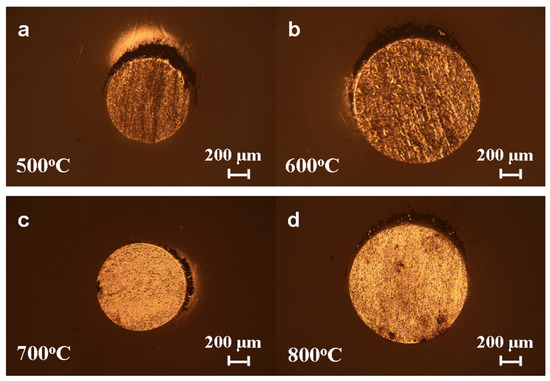 Optical images of flat worn surface under different temperatures: (a) 500 °C, (b) 600 °C, (c) 700 °C and (d) 800 °C.