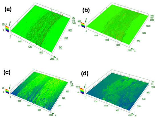 Three-dimensional images of the worn surface of BN coatings under different temperatures: (a) 500 °C, (b) 600 °C, (c) 700 °C and (d) 800 °C.