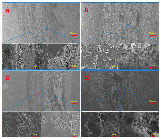 SEM images of the worn surface of BN coatings under different temperatures: (a) 500 °C, (b) 600 °C, (c) 700 °C and (d) 800 °C.