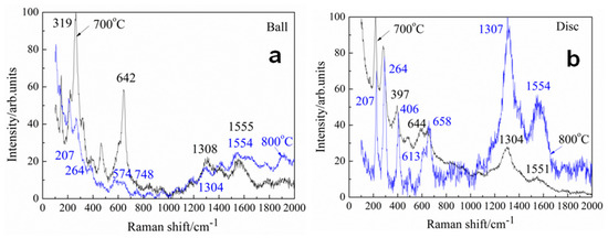 Raman spectra of the worn surface at 700 °C and 800 °C: (a) ball and (b) disc.