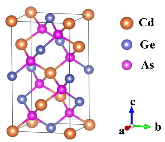 In this work, we calculated the structural optimization and performance of the crystal using the Vienna ab-initio Simulation Package (VASP) []. The GGA–PBE method is used to accurately calculate the total energy and exchange-related interactions. We use the HSE06 method to avoid the underestimation of bandgap values and the overestimation of optical responses in standard density functional theory (DFT) [] calculations. The valence electrons of Cd, Ge, and As are 4d105s2, 4s24p2, and 4s24p2, respectively. In the electron self-consistent iterative cycle, the criterion for convergence is 1 × 10−5 eV/Å for the total energy and 1 × 10−6 eV for the atomic relaxation. The truncation energy is set to 520 eV. The k-points grid is set to 6 × 6 × 4 according to the Monkhorst–Pack scheme, which can ensure that the system always converges well.