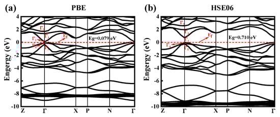 The band structure of CdGeAs2, calculated by the GGA–PBE and HSE06 methods, are shown in Figure 2, and the Fermi level (Ef) is set to zero. These particular points on the x-axis represent points of high symmetry in the Brillouin zone (BZ). For the quadrilateral structure of CdGeAs2, Z = (0.3, 0.3, 0.3), Γ = (0, 0, 0), X = (0.3, 0, 0), P = (0.3, −0.3, 0.3), and N = (0.3, −0.3, 0). The characteristic energy values of the top of the valence band (EV) and the bottom of the conduction band (EC) in the BZ of CdGeAs2 are shown in Table 2. It can be seen from the values in the table that the top of the valence band (VBM) and the bottom of the conduction band (CBM) are both at the Γ point. Therefore, CdGeAs2 is a direct bandgap semiconductor material. The bandgap values (Eg) of CdGeAs2 calculated using the GGA–PBE and HSE06 methods are shown in Table 3 and compared with the experimental value. The Eg calculated by the GGA–PBE method is 0.079 eV, and the Eg calculated using the HSE06 method is 0.710 eV. Compared with the experimental values (0.67 eV [] and 0.53 eV []), the average relative error calculated by the GGA–PBE method is 86.65%, which seriously underestimates the bandgap value, while the average relative error calculated by the HSE06 method is 19.97%, which is closer to the experimental value. The relevant values are listed in Table 3. When the Eg is calculated by the GGA method, the self-interaction of electrons does not cancel completely in the exchange-correlation potential, and its eigenfunction is discontinuous, so the GGA method will underestimate Eg. When the calculation does not include the spin–orbit interactions, the three lower conduction band (CB) states at the Γ point are Γ1, Γ3, and Γ2. The energy splitting value between Γ2 and Γ3 is 0.49 eV, which is very close to the 0.46 eV calculated by Limpijumnong et al. []. At point Γ, the top of the valence band (VB) consists of two symmetric levels Γ4 and Γ5, the latter being a double degenerate level. Due to the crystal field (CF), the non-degenerate Γ4 and double-degenerate Γ5 in the chalcopyrite structure originate from the Γ15 level of the zinc–blende structure []. Therefore, the crystal field splitting can be expressed as ΔCF = ε (Γ5) − ε (Γ4). The calculated ΔCF value of CdGeAs2 is 0.227 eV, which is very close to the experimental value (0.21 eV) [].