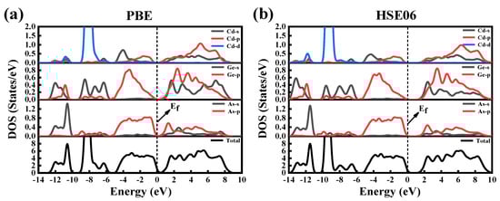 We analyze the distribution of electrons per atomic orbital by calculating the total density of states (TDOSs) and partial density of states (PDOSs). Figure 3 shows the TDOSs and PDOSs of CdGeAs2 calculated using the GGA–PBE method and the HSE06 method. As can be seen from the figure, the VB of CdGeAs2 can be divided into three regions: In the lower VB (−13~−11 eV), it is mainly composed of As-4s states, with a small amount of Ge-4p and Ge-4s orbital hybridization. In the intermediate VB (−10~−6 eV), it is mainly composed of Ge-4s and Cd-4d electronic states. The higher VB (−5~0 eV) is mainly derived from the As-4p and Ge-4p states. The CB is mainly composed of the As-4s, As-4p, Ge-4p, and Ge-4s orbitals. The density of states (DOSs) near the VBM and the CBM are mainly derived from As atoms, as shown in Figure 3. In the experiment, the change of As content will change the bandgap of the single crystal, and then affect the optical transmittance. Therefore, the content of As can be increased appropriately when preparing a CdGeAs2 single crystal.