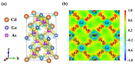 Figure 4 shows the differential charge density of CdGeAs2 to visualize the bond properties. Figure 4a shows the 3D differential charge density of CdGeAs2, where green represents electron loss and yellow represents electron gain. It can be seen that electrons accumulate near the As atom, and that the Cd atom is surrounded by green, indicating that it has a strong ability to lose electrons. The Cd–As atoms form strong chemical bonds with each other, while the Ge–As atoms form weak bonds with each other. Figure 4b shows the 2D plan differential charge density of CdGeAs2. Figure 3 shows that the intermediate region (−10~−6 eV) is mainly derived from the Cd-4d states and is thus strongly localized around the Cd atom. As can be seen from Figure 4b, there is an obvious electron density overlap between the As atom, the Ge atom, and the Cd atom, which indicates that the bonds Ge–As and Cd–As have covalent properties. The density lines in the 2D differential charge map indicate that the Cd–As bond has stronger covalent properties than the Ge–As bond. This result is consistent with the Mulliken population analysis.