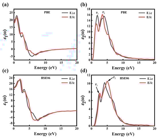 In this paper, the GGA–PBE and HSE06 methods are used to calculate the dielectric function of CdGeAs2 material. Due to the symmetry of the crystal, the dielectric function is decomposed into two components. E⊥c is the electric field along the x and y directions (the electric field perpendicular to the optical axis), and E//c corresponds to the z direction (the electric field parallel to the optical axis). Figure 5a,c show the real part ε1(ω) of the dielectric function calculated by the GGA–PBE and HSE06 methods, respectively. When ε1(ω) photon energy tends to 0, the average static permittivity (ε1ave (0)) of CdGeAs2 calculated using the GGA–PBE and HSE06 methods are 18.42 and 16.57, respectively. The experimental value of the dielectric function is 15.4 [], and the relative errors are 19.61% (GGA–PBE) and 7.59% (HSE06). Therefore, the results calculated by the HSE06 method are closer to the experimental value.