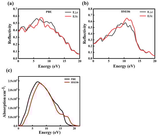 In this paper, the GGA–PBE and HSE06 methods are used to calculate the reflection and absorption spectra of CdGeAs2 crystals, as shown in Figure 6. The CdGeAs2 reflectance spectrum obtained according to Equation (5) is shown in Figure 6a,b. The reflectance shows obvious anisotropy along different directions. Due to the band transition of CdGeAs2, the reflectance is proportional to the energy change. The reflectance reaches its maximum value around 10.0 eV. With increasing energy, the reflectance rapidly decreases to 0. In conclusion, the CdGeAs2 crystal has low reflectance in the infrared band.