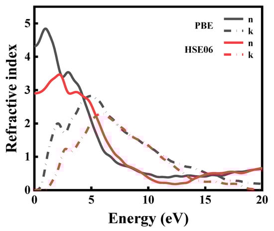 The refractive index and the extinction coefficient of CdGeAs2, calculated by the GGA–PBE and HSE06 methods, are shown in Figure 7. The propagation speed of light wave in CdGeAs2 determines the refractive index (n), and the attenuation of light wave determines the extinction coefficient (k). The average static refractive index calculated by the GGA–PBE method and the HSE06 method are 4.67 and 2.96, respectively. The extinction coefficients calculated by the GGA–PBE method have peaks at 2.07 eV and 4.95 eV. The peak values calculated by the HSE06 method were 2.79 eV and 5.93 eV, which is consistent with ε2(ω).