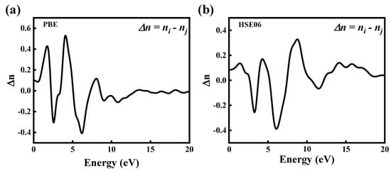 The birefringence (Δn) of the CdGeAs2 crystal calculated using the GGA–PBE and HSE06 methods is shown in Figure 8. The birefringence is expressed as the difference between two or three main refractive indices () in heterogeneous bodies. The birefringence is an important physical quantity in measuring nonlinear crystal properties. The most suitable birefringence range of mid-infrared nonlinear optical crystal is 0.04 < Δn < 0.1 []. According to Figure 8a, the static birefringence of CdGeAs2 calculated using the GGA–PBE method is 0.11, which reaches the maximum value of 0.54 at 4.09 eV. As can be seen from Figure 8b, the static birefringence of CdGeAs2 calculated using the HSE06 method is 0.08, which reaches the maximum value of 0.33 at 7.59 eV. At the wavelength of 10 μm, the experimental value of birefringence is 0.0864 []. The relative errors are 27.31% (GGA–PBE) and 7.41% (HSE06), so the result calculated by the HSE06 method is closer to the experimental value. By comparing the results calculated using the GGA–PBE and HSE06 methods, it is found that the bandgap of the CdGeAs2 crystal is underestimated by the GGA–PBE method, which leads to the increase in the average static refractive index and birefringence in the mid-far infrared region.