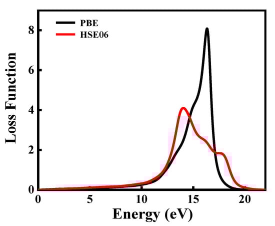 According to Equation (7), the energy loss function of CdGeAs2 is calculated, which describes the energy loss of the electrons when they pass through the medium. The energy loss spectrum of CdGeAs2 is shown in Figure 9. The maximum energy loss peak at 16.36 eV is calculated by the GGA–PBE method, and its value is 8.09. The result obtained by the HSE06 shows that the maximum energy loss occurs at 14.06 eV, and its value is 4.08. In addition, it can be concluded from the band structure and the DOS analysis that the highest peak comes from the transition of the As-4s, Ge-4s, and Ge-4p orbitals from the VB to the CB.