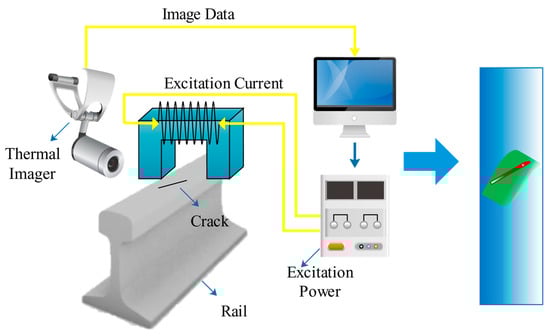 Furthermore, PEC can integrate with thermal imaging technology based on electromagnetism’s eddy current and Joule heat phenomena. Eddy Current Pulsed Thermography (ECPT) uses infrared thermography to obtain the temperature distribution and conduction of conductive specimens under pulsed eddy current excitation [79]. The length, width, depth, and inclination of rail defects can affect the thermographic data. The principle of ECPT is shown in Figure 4.