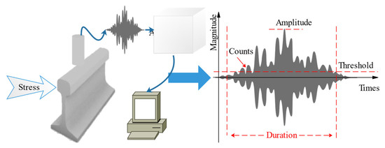 Acoustic emission inspection is based on the principle that internal local energy is rapidly released when an object is subjected to a force, resulting in a transient elastic wave [109]. The elastic wave signal will be emitted at the moment of cracking. Collecting and analyzing this elastic wave makes it possible to determine whether there is damage on the rail [110]. The principle of acoustic emission inspection is shown in Figure 7.