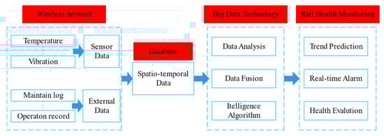 Rail status monitoring systems mainly include resistance strain gauges, piezoelectric strain sensors, fiber optic strain sensors, vibration sensors, acoustic emission sensors, and acceleration sensors [116]. The development of advanced sensors and information technology in rail inspection has provided a platform for the expansive growth of data. It has created a new paradigm in storing, processing, and applying inspection data [117]. Big data is emerging as a new trend for rail inspection. More and more existing rail inspection instruments have been combined with big data management technology. By fusion of mass storage data, a rail status monitoring system can establish a defect-health condition (material state, equipment performance) model. The model can evaluate current rail health conditions and give a risk warning forecast [118]. The big data cloud could be established, combined with historical data, to get the trend of the defect evolution curve. Meanwhile, it can give the overall rail route and local risk section of the remaining life-accurate assessment. Also, it can provide maintenance, decommissioning, renewal, improvement, and other suggestions for the decision-making department [119]. The structure of the rail health monitoring system is shown in Figure 8.