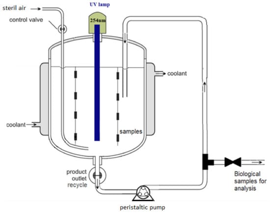 In the last decade, there have been various studies on the chlorine and UV disinfection of wastewater containing antibiotics [], UV radiation simulating the sun’s irradiative action [], or the use of photocatalytic substances as suspended particles or thin films [,,]; innovative strategies are needed to develop new methods for the effective control of bacterial infections in water [,,].