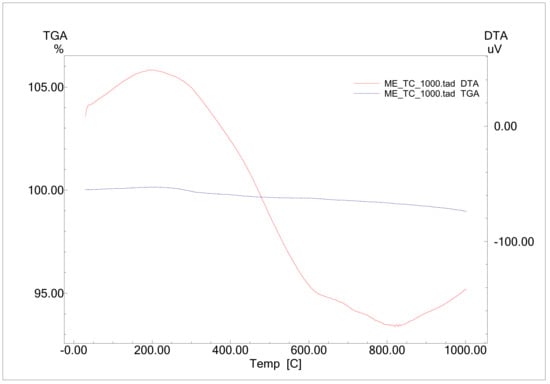 Figure 2 presents a thermal analysis of the CRT waste, performed to determine the sintering temperature of the glass, which occurs at the lowest point on the DTA curve, where the highest endothermic reaction is recorded in the sample. In this case, the temperature of 820 °C was chosen as the sintering temperature for our samples. The exothermic peak at around 200 °C accounted for the decomposition of the polyvinyl alcohol, while the endothermic peak that occurred at 600 °C is attributable to the glass transition.