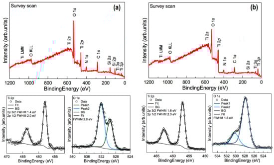 The survey spectrum of the samples shows a nitrogen signal around 405 eV from the residual nitrogen gas used for charge compensation. The C 1s peak is present at 285.3 eV attributable to hydrocarbons (CC/CH) present on the surface. XPS signals of Ti 2p were noted at binding energies around 458.5 eV for Ti 2p3/2 and 464.3 eV for Ti 2p1/2, in good agreement with standard TiO2 []. The FWHM of the Ti 2p3/2 peak is smaller than that of the 2p1/2 peak, due to the Coster-Kronig effect. For samples with 1% TiO2, O 1s can be fitted with two peaks at 532 eV and 529.7 eV, while for the samples with 3% TiO2 O 1s, the peaks are at 529.7 eV and 528 eV. The peaks located at 529.7 eV and 532 eV correspond to the O 1s binding energy for TiO2, while the peak at 532 eV is attributed to H–O from the chemisorbed water on the surface, which further contributes to the photocatalytic activity []. Si 2p (103 eV) and Si 2s (155 eV) peaks are due to SiO2 from the CRT glass substrate.
