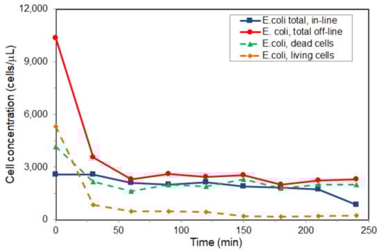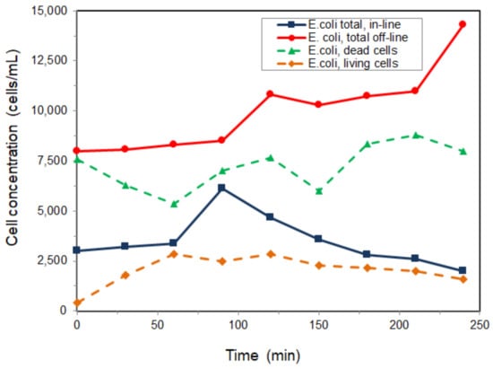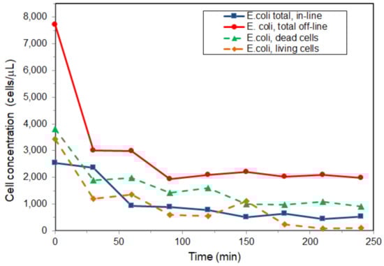 Analyzing the resulting flow cytometric data for Experiment 1, it can be concluded that, at a concentration of 3% TiO2, the bactericidal effect is irreversible, and the efficiency effect of inactivation is consistent, considering the initial cells concentration before the UV radiation impact. Except for the first two points in the graph, which correspond to the growth duration without the UV rays induced by the laboratory lamp, the result for the total amount of cells and viability (living and dead cells) in-line and after 5 h indicates a conjugate bactericidal effect from the UV-TiO2 system.