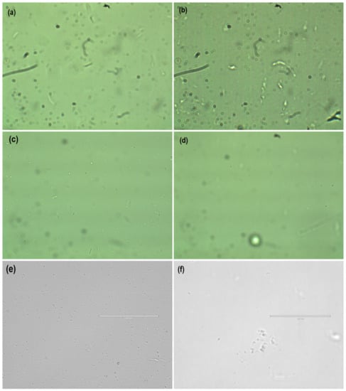 E coli control sample (a) t = 0; (b) t = 240 min, Experiment 1 (c) t = 0; (d) t = 240 min, and Experiment 2 (e) t = 0; (f) t = 240 min.