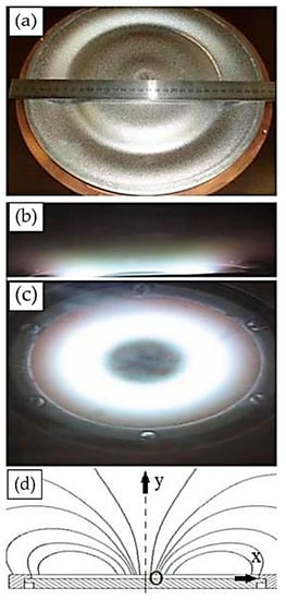 To mathematically describe the shape of target erosion, we place the coordinate system in the plane of the arched magnetic field (Figure 1d) and choose the origin O to be located at the center of the magnetron target so that the Ox axis is directed along the target surface and the Oy axis is perpendicular to the surface. Secondary electrons emitted perpendicular to the target plane, under the influence of an electric field, move with acceleration parallel to the Oy axis; the magnetic field deflects electrons perpendicular to the xOy plane along a cycloid, the radius of which is determined by