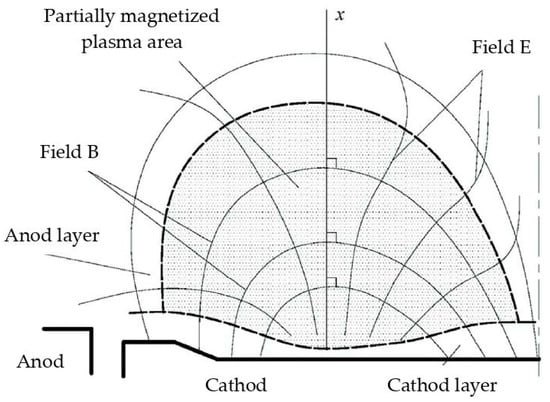 Based on long-term investigations of the magnetron discharge, summarized in [11], the magnetron discharge can be divided into three characteristic areas: the cathode layer, the area of partially magnetized plasma, and the anode layer. The magnetic field, the electric field, and the characteristic areas of the plasma are schematically presented in Figure 2. In a magnetron discharge for typical MSS, B is in the range of 0.1–0.001 T.
