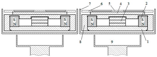 As an example, the calculation of the predicted erosion profile of a dual MSS target was performed. Its schematic is shown in Figure 3. The design of the magnetron (44 × 158 × 438 mm) includes: 1—base (133 × 413 mm) made of steel (A570(36)); 2—peripheral magnets (20 × 25 × 45 mm) made of NdFeB N48H with an induction coercive force of 1353 kA/m and a residual magnetic induction of 1.36–1.42 T; 3—central pole piece in the shape of match bars made of steel (A570(36)); 4—target (6 × 120 × 400 mm); 5—central clamp and 6—peripheral clamp of the target; 7—shield under floating potential; 8—body made of duralumin aluminum alloy; 9—holder grounded to the chamber body and isolated from the magnetron. Two identical magnetrons form a dual sputtering system. Power relative to the body is alternately supplied to the cathodes of the magnetrons, galvanically isolated from all other parts.