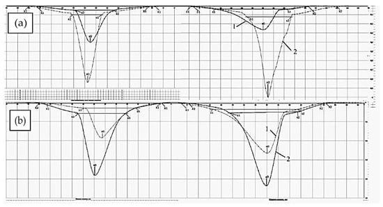 Predicted erosion profile for the left magnetron of the dual system of magnetrons with 1—3 bars, 2—1 bar; (a) dual magnetron without a magnetic shield; (b) dual magnetron with a magnetic shield.