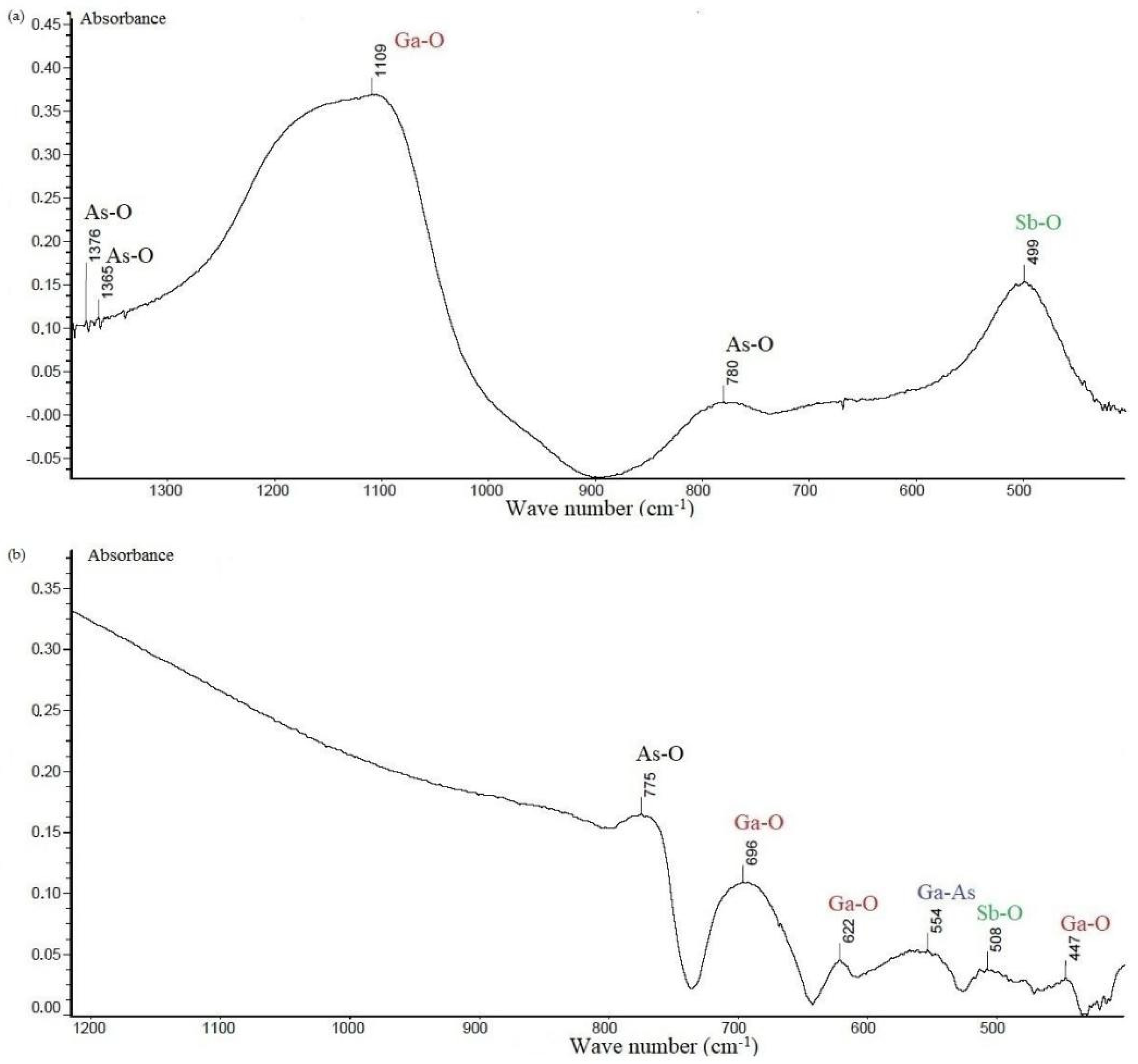 It was found that gallium, arsenic, and antimony were present in the films. Since thermal oxidation was carried out in an oxygen stream, oxygen was the deficient component of the film. The content of oxygen cannot be directly determined by this method and therefore it was calculated by assuming that oxygen made the remainder up to 100%. Moreover, based on its large content, it can be assumed that all other elements were in an oxidized state.
