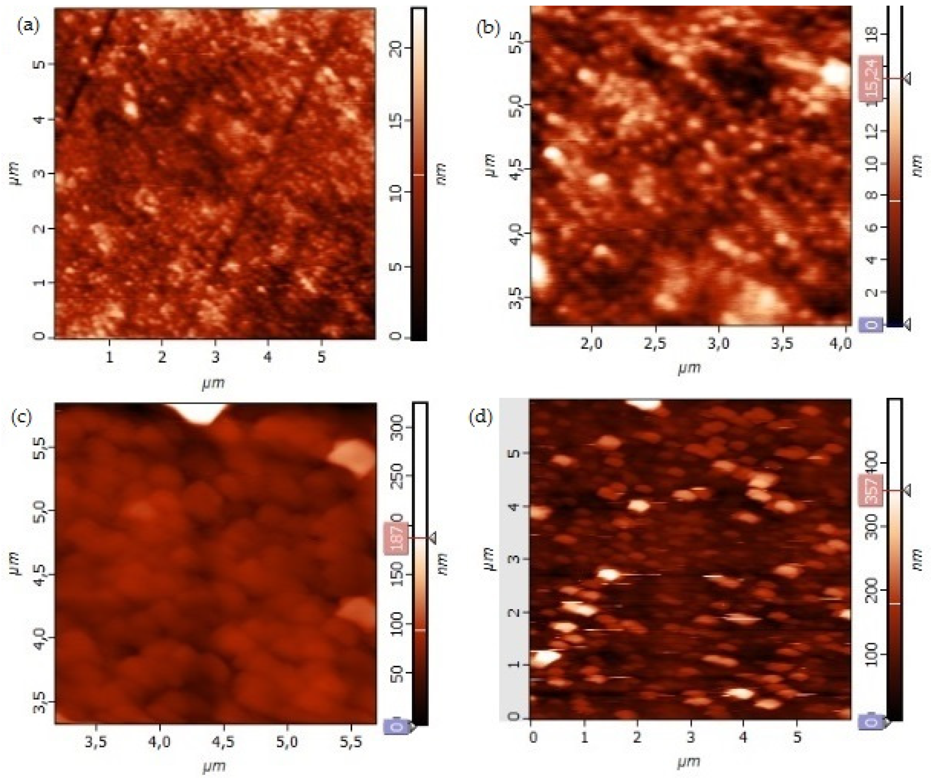 3.1. Film Composition and Surface Morphology