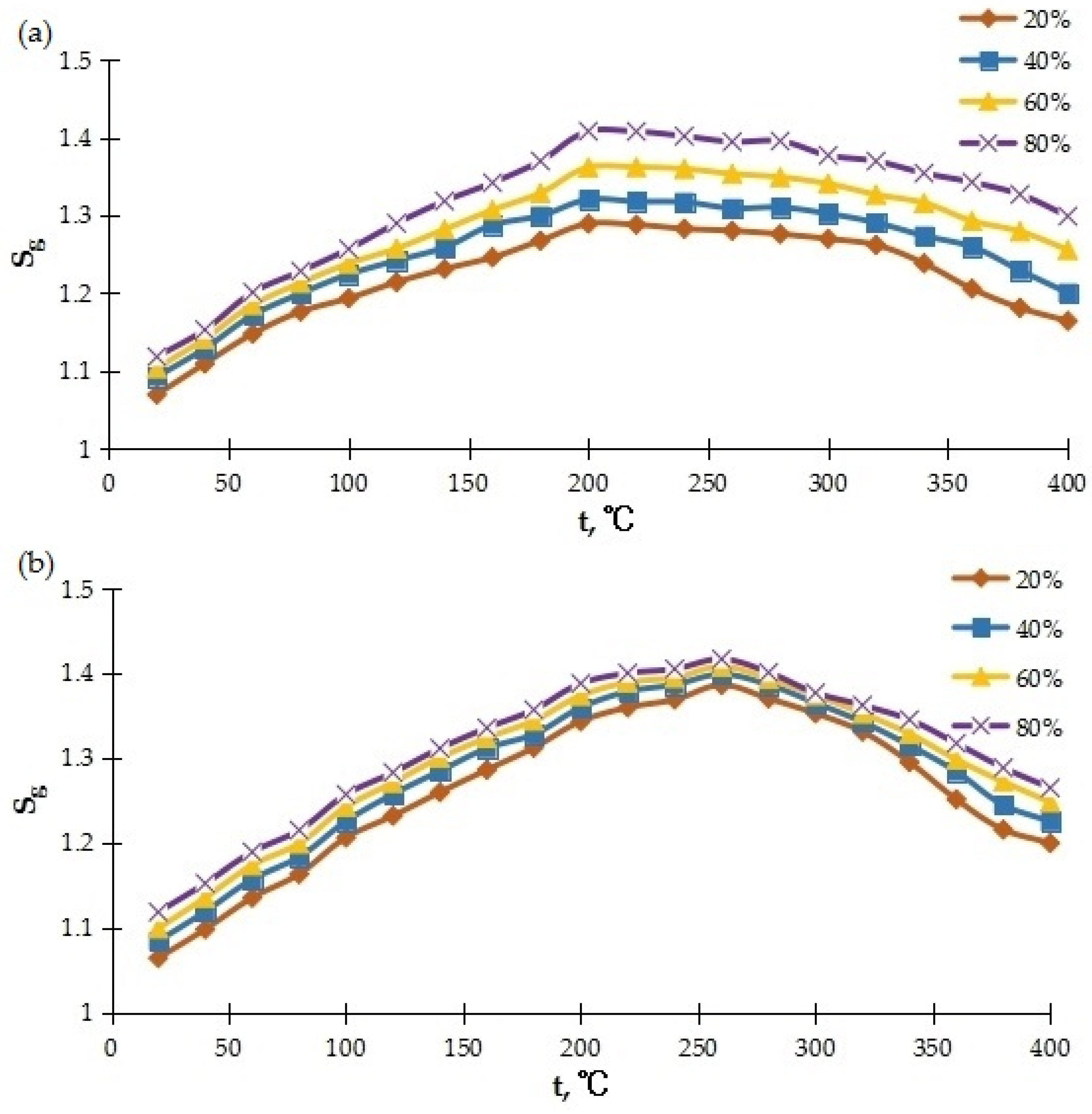 Figure 5). The value of the sensor signal increased from 1.1 to 1.4 conventional units, and then decreased with increasing temperature. With an increase in the antimony oxide content in the composition, under the action of which the film was formed, the value of the sensor signal naturally increased.