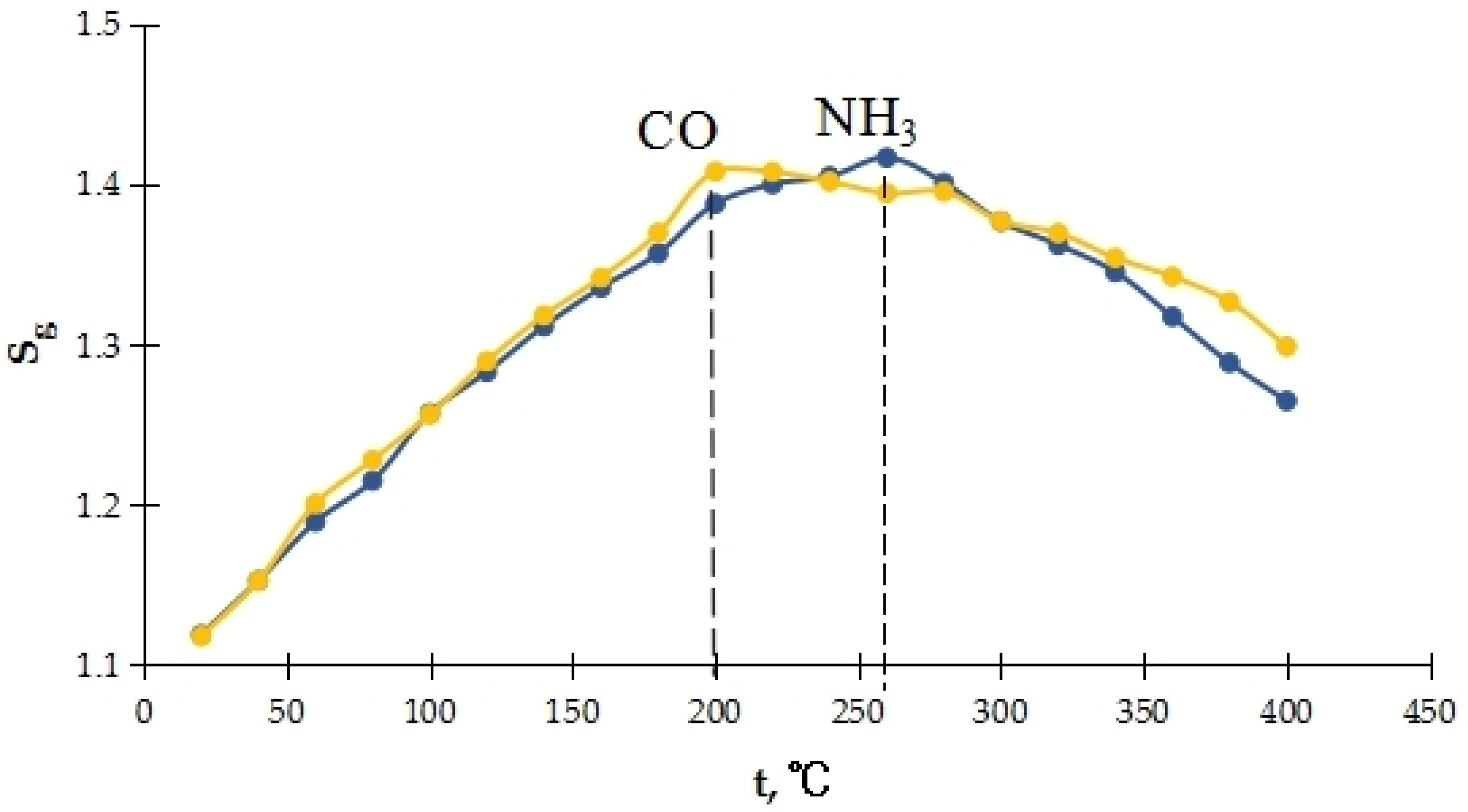 2 under normal conditions does not occur below 800 °C, and the formation of NO starts at around 900 °C. Due to the interaction of gas molecules with the substrate, the oxidation temperature should decrease, and then it can be assumed that the decrease in the sensor signal at increased temperatures is a consequence of the partial occurrence of the reactions described above.