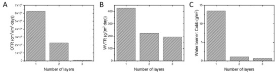The effect of the number of coating layers on the gas barrier performance was first evaluated by measuring the permeation of oxygen and water vapor. The oxygen transmission rate (OTR) was determined by measuring the oxygen concentration increase inside a nitrogen-filled cell sealed by the coated paperboard when exposed to air. Air is a mixture of N2 (78.08%), O2 (20.95%), Argon (0.9%), CO2 (0.04%) and other small traces of gases [42]. Importantly, the air had a relative humidity (RH) of 50% to 60%, thus water vapor also is present in air. The OTR of a single-layer coating, shown in Figure 2A was very high (6.2 × 104 cm3/(m2∙day)), and applying a second coating layer reduced the OTR by a factor of 3 to 2.3 × 104 cm3/(m2∙day). Applying the second coating layer reduced the number of coating defects, which is beneficial for lowering gas permeation. The oxygen barrier was significantly improved by applying a third coating layer, as evidenced by a twenty-fivefold decrease of the OTR value to 9.2 × 102 cm3/(m2∙day) compared to double-layer coatings. This large improvement in barrier performance is remarkable, since with applying the third coating layer, only 2 extra µm is added to the total thickness. This third coating layer was applied on an even smoother surface than the second layer, and during drying the overall polymer coating was exposed to 60 °C for two additional hours which, might have improved the barrier performance [43,44,45,46]. Reference values for maximum accepted permeabilities are challenging to find and depend on the type of packed food. A value found in literature is that the OTR should be lower than 15 cm3/(m2∙day) to become interesting for the food packaging application [47], however, it should be highlighted that a direct comparison is not possible due to differences in layer thickness. In fact, the large majority of the literature reported OTR values do not specify the thickness of the layers used to determine those values, which, in our view, should be reported. Hence, we report the thickness of our coating layers but to avoid confusion, do not include it in the OTR and WVTR calculated values.