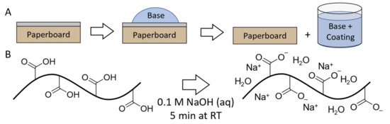 (A) Schematic representation of the base treatment of the waterborne coating. (B) Schematic depiction of the influence of base (0.1 M NaOH) on the carboxylic acids of the ASR causing deprotonation.