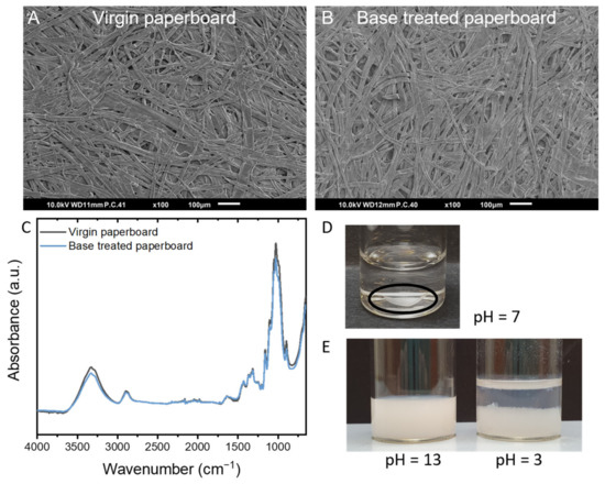 SEM images of the (A) virgin and (B) base-treated (0.1 M NaOH (aq) for 5 min) uncoated paperboard with (C) corresponding FTIR spectra. (D) Photograph of free-standing film (in black circle) immersed in demineralized water (pH = 7). (E) Photograph of free-standing film of the coating dispersed in pH = 13, followed by lowering the pH to 3 causing sedimentation of the polymers.