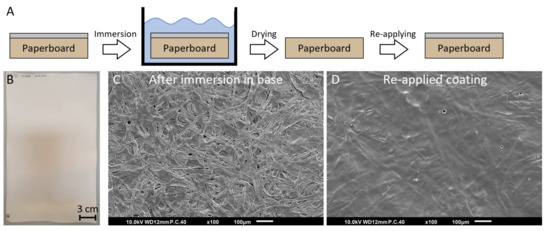 (A) Schematic representation of the base treatment by immersing the coated paperboard in 0.1 M NaOH for 5 min and subsequently extensive rinsing with demineralized water. After drying the treated paperboard under vacuum overnight, a new coating layer was re-applied on the paperboard. (B) Photograph and (C) SEM image of the coated paperboard was immersed in 0.1 M NaOH solution for 5 min and dried in vacuum overnight. Subsequently, (D) SEM image after applying a new coating layer on the base-treated paperboard.